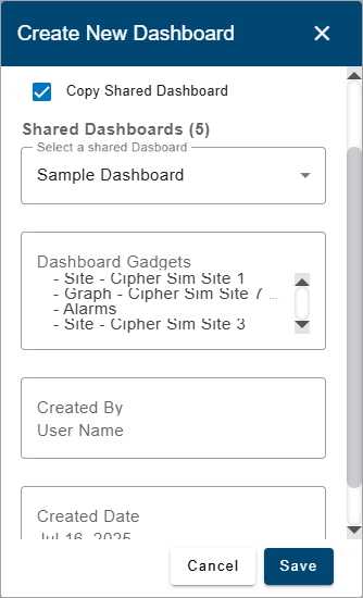 2. If copying a shared dashboard, click the Copy Shared Dashboard check box to display a drop-down list of available dashboards.