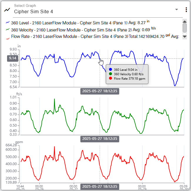 | This gadget is used to display information about a specific site, including a graph of the most recent level, velocity and flow rate data and a timestamp of the last time data was ingested from the site.