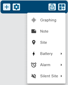 2. Click the type of gadget you want to add. 3. For a battery, alarm or silent site gadget, you must select how many sites will be displayed in the gadget and how those sites will be selected. Click either: • Site to display only a single site • Tenant to display all sites in a specific tenant • Tag to display all sites assigned a specific tag A new gadget will be added to the dashboard. By default, the gadget will be added as a single cell in the next available grid cell.