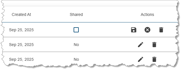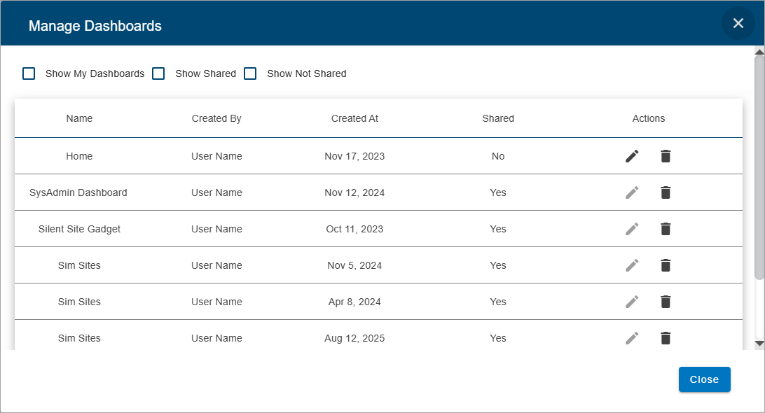 This dialog box is used to rename, share or delete existing dashboards. A dashboard can only be renamed or shared by the user that created the dashboard. A dashboard can be deleted by either the user that created it, or a user with the Administrator role. Check boxes above the table can be used to filter the dashboards listed.: