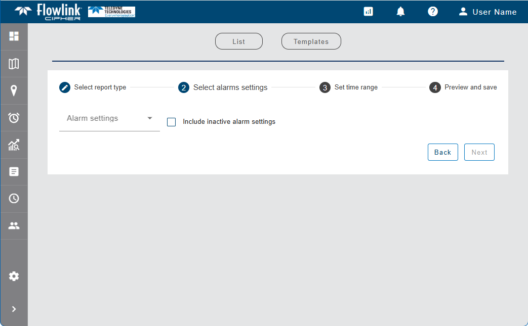 This step is used to select the alarm settings for which data events will be recorded in the resulting report. The drop-down list is populated with all alarm settings that have been defined in the Alarms List page. Multiple alarm settings can be selected if needed.