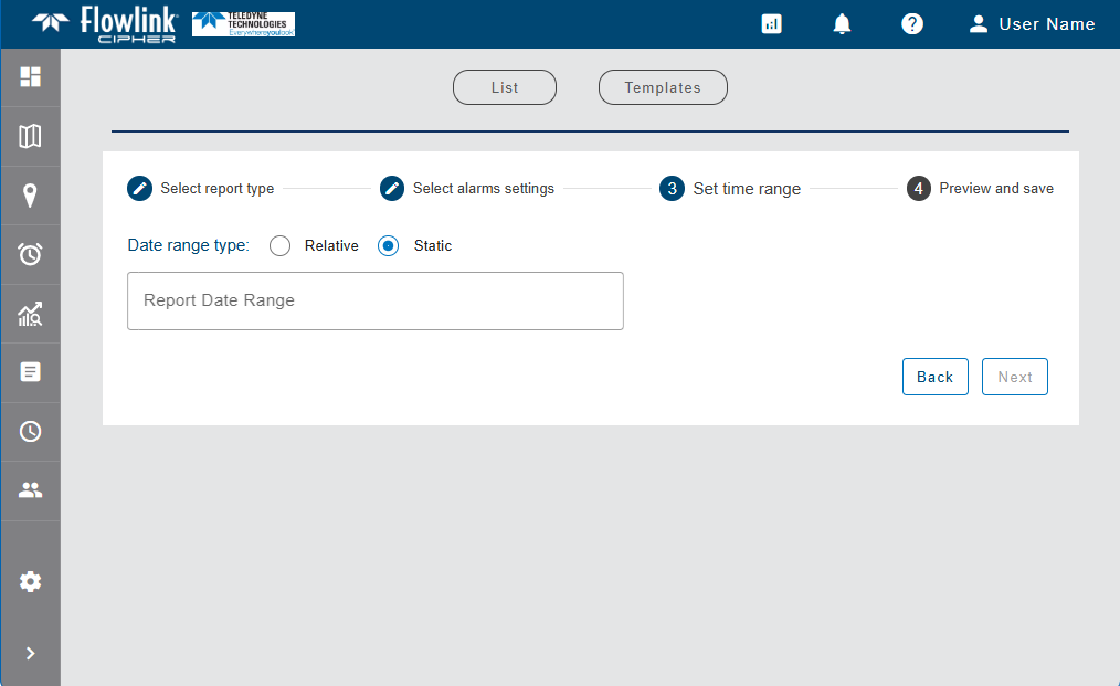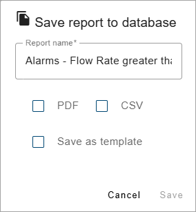 • Report name: The name to assign to the report. By default, this is populated with the report type, the alarm settings and the creation timestamp.