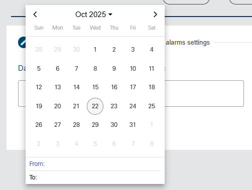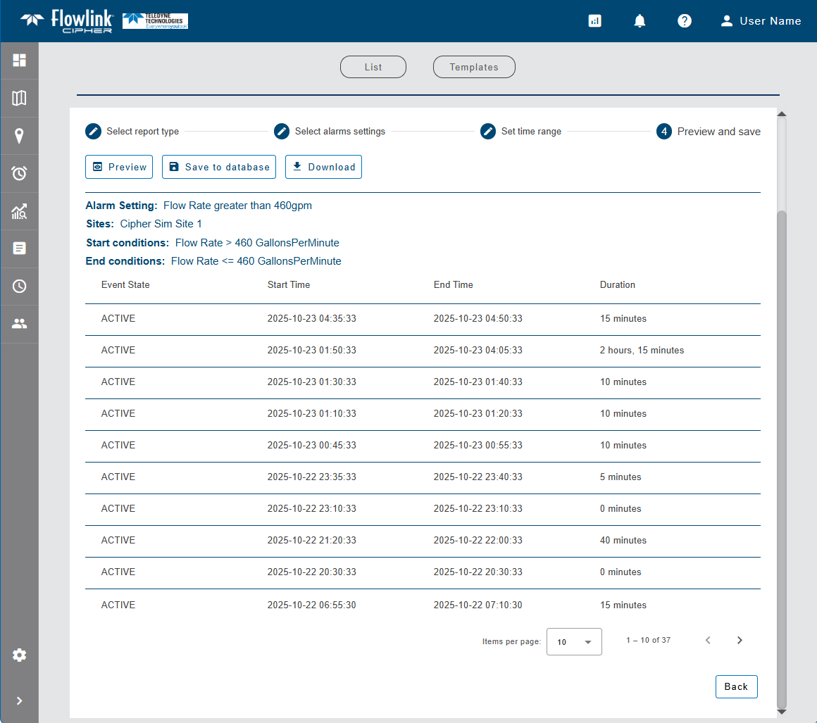 An Alarms Report is a table of all Data type events that have been generated by one or more alarm settings within a specified time range.