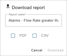 • Report name: The name to assign to the report. By default, this is populated with the report type, the alarm settings and the creation timestamp. This will also be used in the file name of the resulting file.
