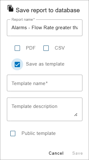 • Save as template: Create a report template using the settings defined for this report. The template can then be used to create future reports. See Report Templates for more information on report templates. If this option is enabled, additional fields are added to the dialog box.