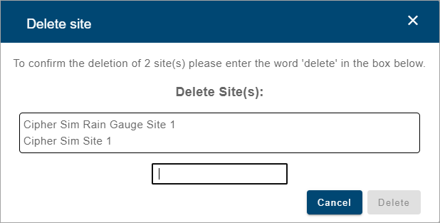 | Delete Site Delete the selected site, removing it from Cipher and all site-selection controls. The System Administrator, Administrator or Site Manager role is required to delete a site. When a site is deleted, the following items related to the site are also removed from Cipher: • Devices and their datasets • Computed datasets • Alarm settings • Events on the Alarm screen Attempting to open a graph that contains a dataset from a deleted site will display a message stating that the graph source data has been deleted. Once a site and its data has been deleted, it cannot be recovered. 1. Click the Delete Site button in the Actions column. A message is displayed asking to proceed with the deletion. If multiple sites were selected, the number of sites to be deleted will be included in the message, along with the names of the sites to be deleted. The word "Delete" must be typed in the field provided in order to complete the deletion. The field is not case sensitive, both upper and lower case letters will be recognized. These features are in place to ensure that sites are not deleted accidentally.